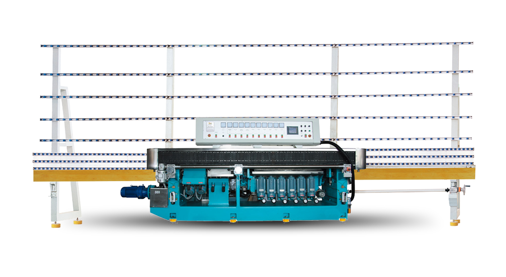 該機主要用于玻璃底邊及前大倒角磨邊及拋光,該機采用PLC控制,其中前面六個馬達角度在0°~45°間任意可調(diào),并在觸摸顯示屏上顯示角度及倒角寬度,自動磨削時可較準確的調(diào)整和設置前倒角的各項參數(shù)。