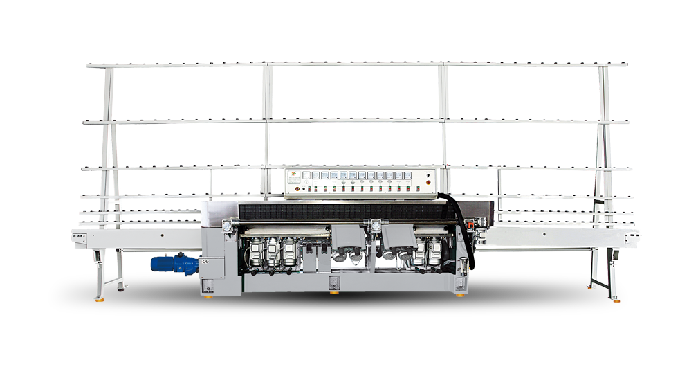 該機器主要用于平板玻璃底邊及大棱邊的磨削,其中磨頭分布及其合理,當(dāng)中有5個磨削底邊,4個磨削45°大棱邊,能精確地一次過磨出玻璃的平底邊及大棱邊,本機具有實用性強,操作簡便,使用成本低等優(yōu)點。